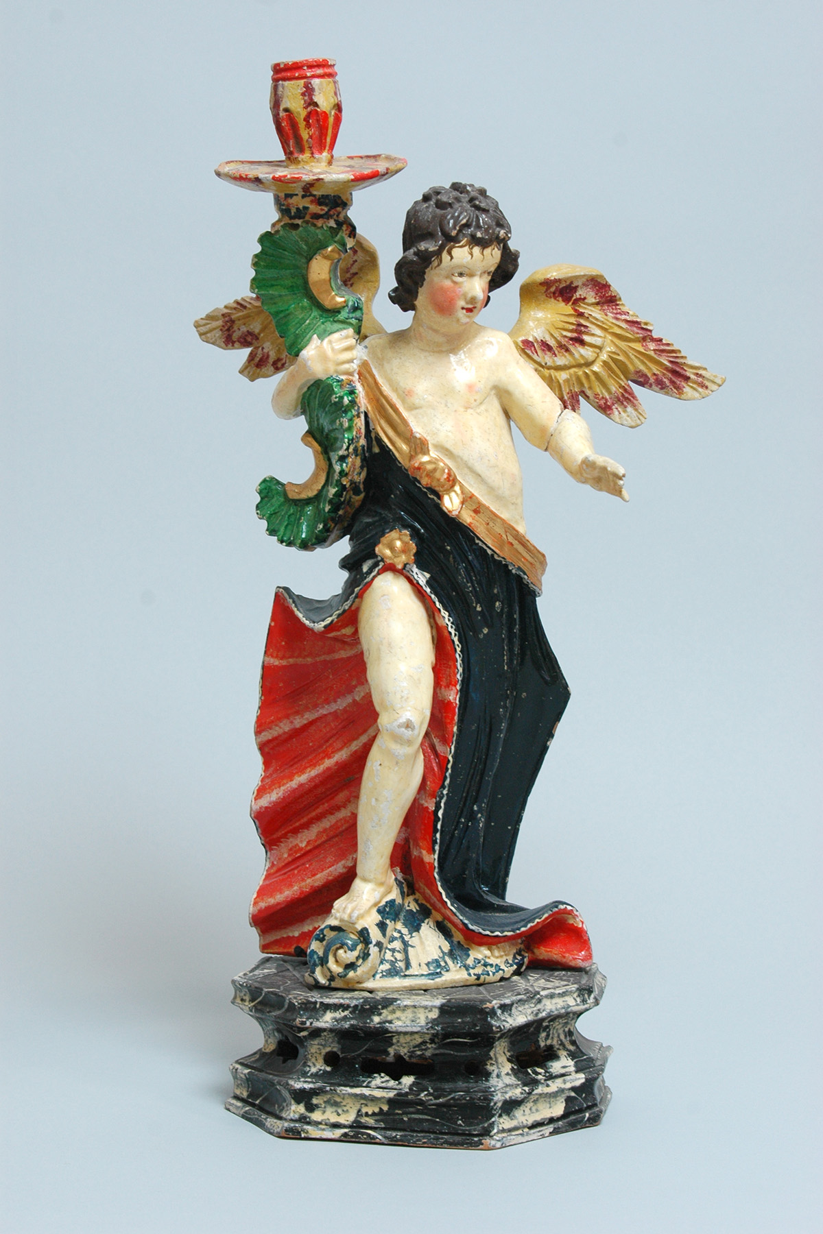 Am italienischen Seicento orientiert sich dieser auf eine marmorisierte Säulenbasis aufgesetzte Leuchterengel. Form und Farbgebung könnten von Keramikvorbildern stammen. Das rundliche Gesicht des Engels zieren rote Wangen, die Stirn zart aufgemalte braune Locken. Leuchterengel wurden immer mit ihrem Gegenstück hergestellt und waren Teil der seriellen Grödner Hauskunst im 18. und 19. Jahrhundert.
