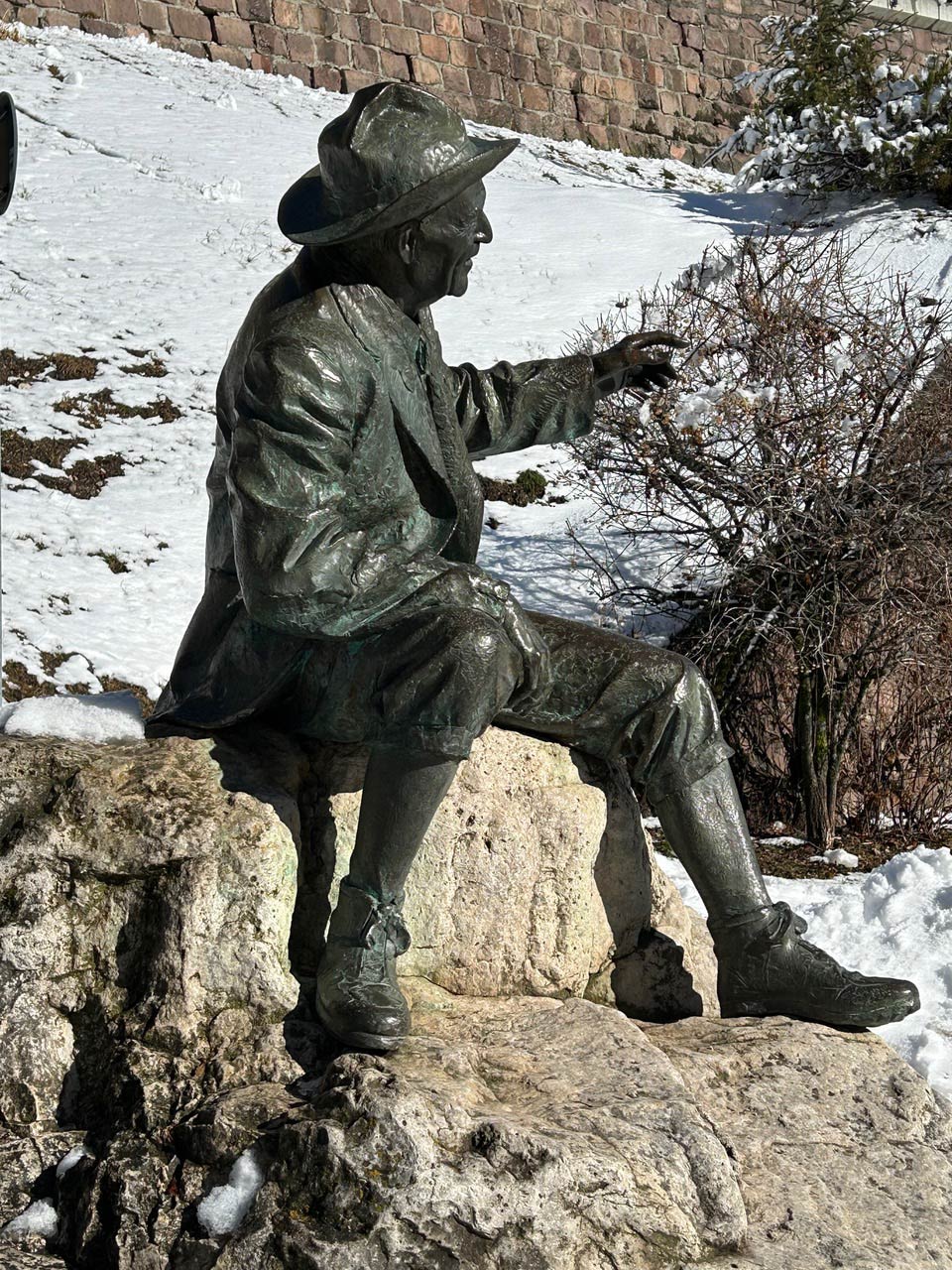 Luis Trenker ist einer der berühmtesten Grödner. Seit 1992 – Trenker wäre in diesem Jahr 100 geworden – sitzt er als Bronzefigur von Hermann Josef Runggaldier auf einem Dolomitsockel an der Promenade, die seinen Namen trägt.