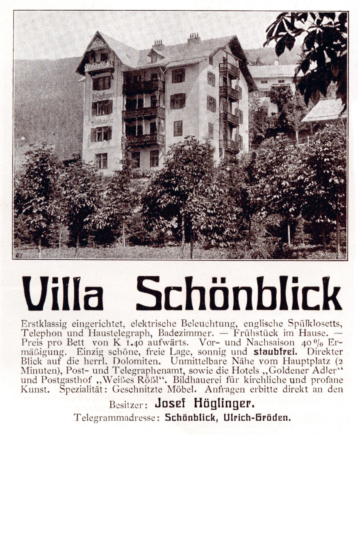 1907 ließ der Altarbauer Josef Höglinger unterm Plajes-Hof die Villa Schönblick bauen. Er richtete darin seine Wohnung, eine Werkstatt, Zimmer für zugezogene Handwerker und eine kleine Frühstückspension ein.